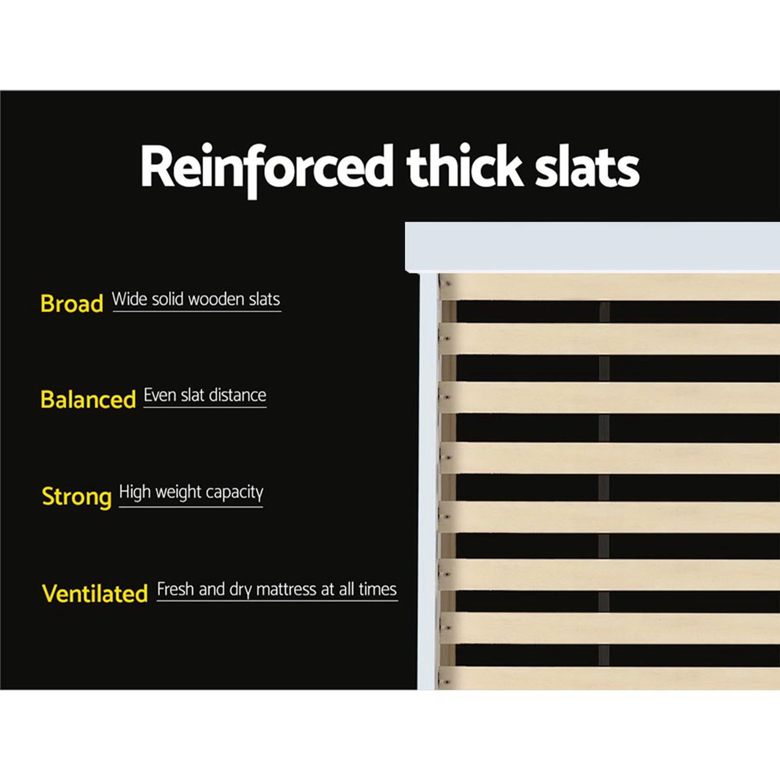 Made of natural pine wood, the Artiss Conqueror Bed Frame is ideal for kids as it for any adult. Strong and sturdy, the bed frame comes with a solid plywood slated base, reinforced supports across the frame, heavy-duty steel fixings and smooth edges all round. Finished in a non-toxic, eco-friendly white paint, the neutral coloured bed frame is also very practical with ample storage from a headboard that comprises three open compartments and a closed shelf that folds down as well as more room beneath the bed frame for optional trundle drawers or any storage boxes. Fact it, this charming bed frame is designed to please in more ways than one.