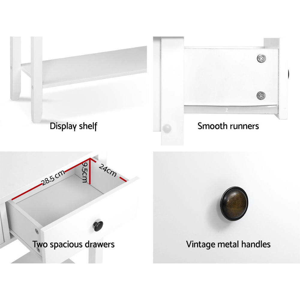 Every home that considers itself a stylish and contemporary example should have our beautiful Console Table lining its doorway or hallway. It can also serve as a wonderful front console table for your caf��, restaurant or shop to welcome customers with chic and charm. Crafted from high-quality E1 MDF board with smooth NC lacquer finish, the console table features a timeless design that is well proportioned and durable in every aspect. Two generous-sized drawers with vintage-style metal handles provide ample storage space for your essentials and knick-knacks while the wide tabletop and large bottom shelf let you display your favourite home d��cor in resplendent style. Make a grand entrance for your guests or even for yourself with our console table. It will be a gracious welcome indeed.