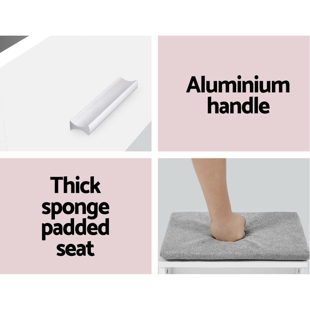 Beauty is in the eye of the beholder. And our Artiss Dressing Table Set is definitely a beauty to behold. Made of sturdy 15mm thick particle board with melamine, the dressing table is embellished with many practical features. There is a hidden cabinet with three shelves behind the large sliding mirror and one spacious drawer with a sleek aluminium handle, providing ample storage space for your cosmetics, perfumes, jewelleries, fashion accessories and other personal essentials. The table offers ample legroom too for you to groom with minimum hassle and a well-padded stool completes the ensemble. Not least, the smooth and impeccable white finish makes for an easy blend with any d��cor as well as hassle-free maintenance. Create your own personal styling zone with our beautiful and functional dressing table set.