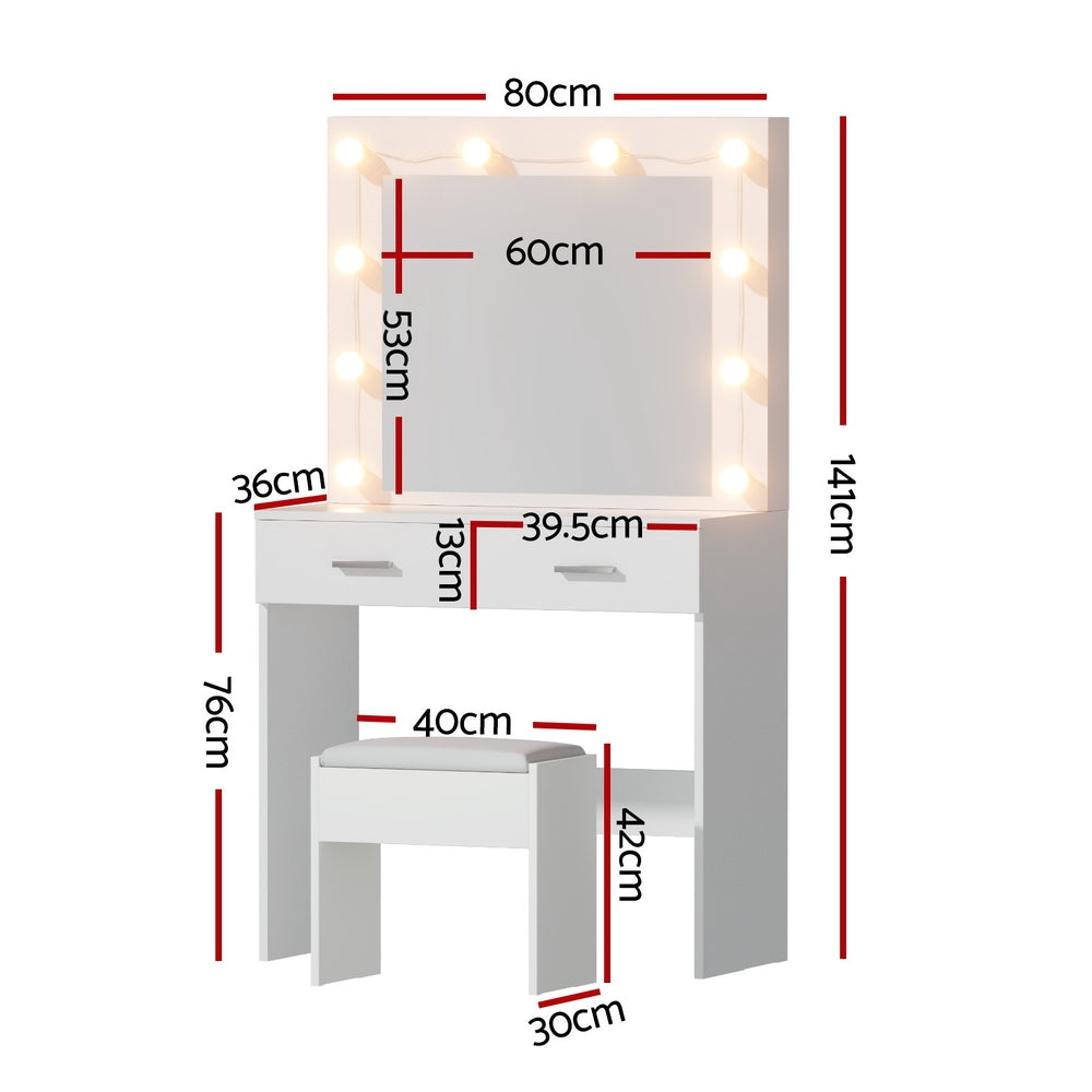 Transform your daily routine with the Artiss LED Dressing Table. Featuring 10 LED bulbs with 3 adjustable colour modes and 10 brightness levels, this vanity desk ensures optimal lighting for any makeup or skincare routine. Its 2 spacious drawers, smooth runners, and metal handles provide elegant and practical storage. The foam-padded stool offers added comfort, while the durable and easy-to-clean design ensures it stays sleek and functional. Whether for a bedroom or professional use, this modern vanity is the perfect addition to your space.