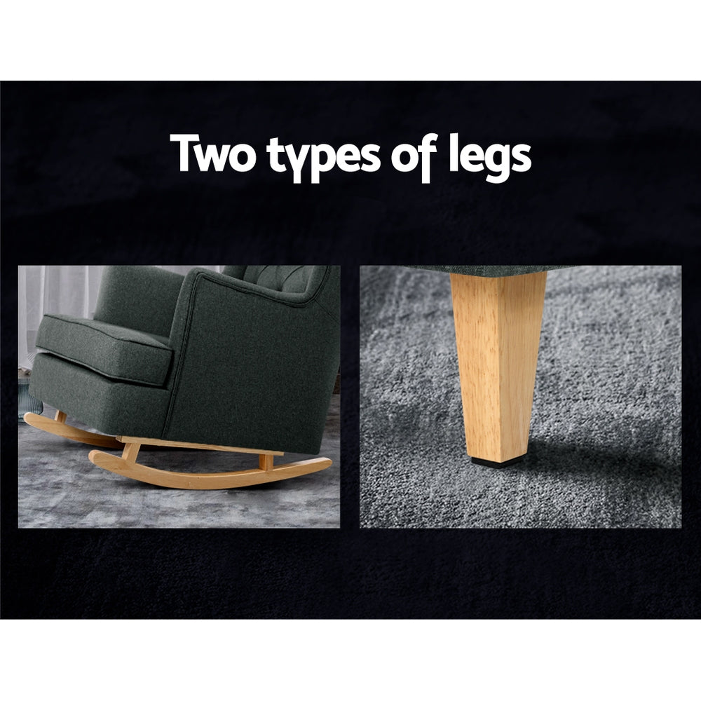 Be swayed. Rock on and relax with our Artiss Gaia Rocking Chair. It comes with two sets of removable legs so that you can use it as a rocking chair or a stationary chair. The gentle swaying of the rocking chair would be perfect for reading, listening to music, taking a much-needed nap, or even rocking your baby to sleep. Or simply swap the legs over and you have a classic accent chair. The iconic design and the tufted wingback exude elegance and timeless appeal. This makes the chair suitable for any décor, from your living room to your nursery. The extra thick foam padding and wide back ensure ultimate comfort with exceptional support. The armchair feet are fitted with pads to keep your floors pristine from scratches and damage. Together with a reinforced wooden frame and quality faux linen fabric upholstery, our armchair is guaranteed to stand up to durable use for many years to come.