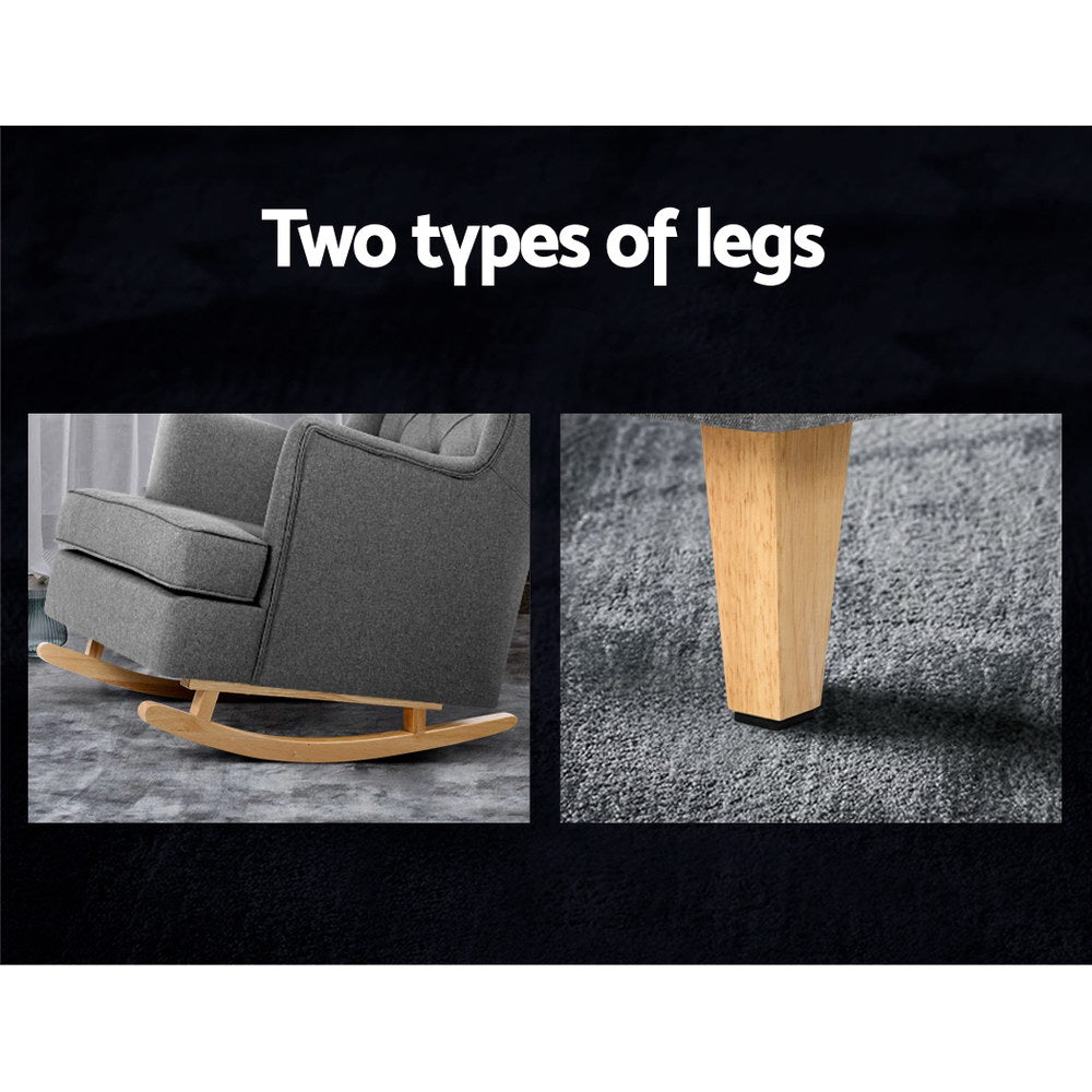 Be swayed. Rock on and relax with our Artiss Gaia Rocking Chair. It comes with two sets of removable legs so that you can use it as a rocking chair or a stationary chair. The gentle swaying of the rocking chair would be perfect for reading, listening to music, taking a much-needed nap, or even rocking your baby to sleep. Or simply swap the legs over and you have a classic accent chair. The iconic design and the tufted wingback exude elegance and timeless appeal. This makes the chair suitable for any décor, from your living room to your nursery. The extra thick foam padding and wide back ensure ultimate comfort with exceptional support. The armchair feet are fitted with pads to keep your floors pristine from scratches and damage. Together with a reinforced wooden frame and quality faux linen fabric upholstery, our armchair is guaranteed to stand up to durable use for many years to come.