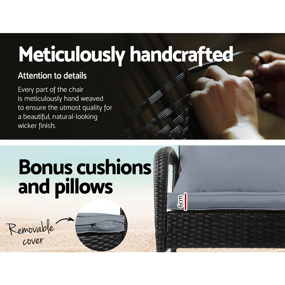 Gently sway to the better moments of life with the Gardeon Outdoor Rocking Set. Our high-quality resin rattan chair and tempered glass wicker side table is made weather-resistant and UV-resistant to stand up to the test of time and climate with their powder-coated steel frame and meticulous workmanship. Better still, the set comes with matching thick cushions and pillows with removable covers to let you rock your leisure time away with utmost comfort. Not least, the table also features a wicker border finish with a tempered glass top for safety and durability. So ease your mind, body and soul with the Gardeon Outdoor Rocking Set. Perfect for both outdoors and indoors use.