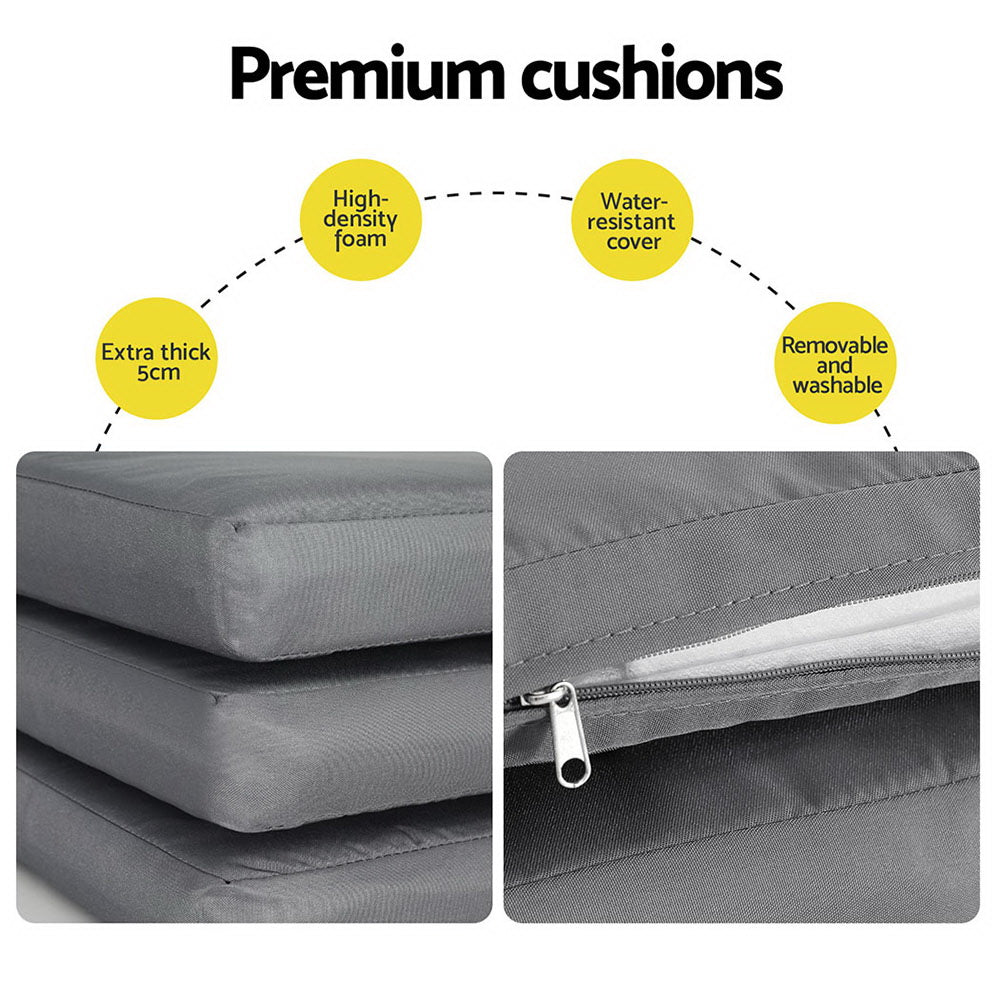 With summer fast approaching, you can once again join the sunshine with the Gardeon 5-piece Outdoor Dining Set. Made from a powder-coated metal frame, the set is designed for outdoor or indoor use in a wide range of weather conditions. The table and chairs are designed to comfortably seat four people across four single chairs, or the table can be extended to fit up to six (extra chairs not included). The stable structure features fixed safety screws, giving each chair a 150kg weight capacity and a table weight capacity of 50kg. The seats are classically designed and completely comfortable with an inclined backrest, comfortable handrails, and 5cm thick foam cushions. The cushions feature removable and washable covers for easy cleaning. The table and chairs feature a slatted surface for easy drainage during wet weather. With easy and hassle-free assembly, the Gardeon 5-piece Outdoor Dining Set is the perfect addition to any backyard, patio or even sitting room.